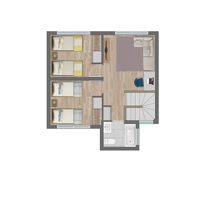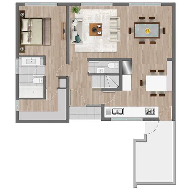 • Cocina con cubierta de quarzo, equipada con encimera, campana y horno eléctrico